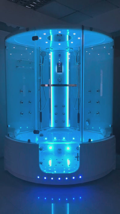 Experience ultimate relaxation with the overhead LED rainfall shower equipped with chromotherapy lighting, 3D circulative opposite hydro-massage, and elegant stainless steel framing and fixtures. The patented Select Series design ensures easy access, eliminating the need to step over the tub, and putting the Maya Bath Comfort Steam Shower at the forefront of modern spa innovation. Transform your bathroom with this groundbreaking blend of comfort, style, and cutting-edge technology.
